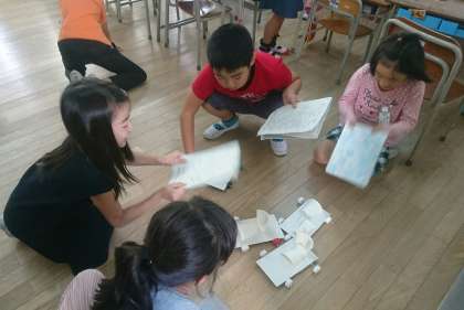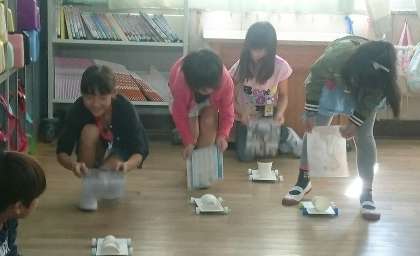 できあがったヨットカーを持ち寄って、子どもたちは早速動かしてみました。どのヨットカーが一番速いのか、競争です。