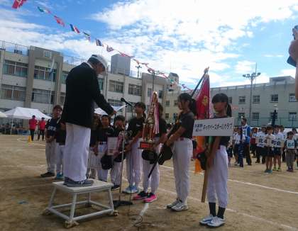 地域の方々の大勢の参加のもと、入場行進、開会式で盛り上がりました。入場行進では、和のミニバスケットボール部、サッカー部、ソフトボール部、キックベースボール部の子どもたちが堂々行進しました。また、開会式では、和のキックベースボール部が昨年度の成績が称えられ拍手が送られました。
