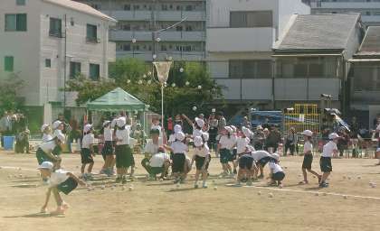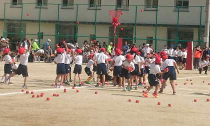 このあと、地域の老人クラブの皆さんといっしょに玉入れに挑戦しました。