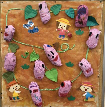 10月のテーマは「サツマイモ」。画用紙と新聞紙でサツマイモを作りました。