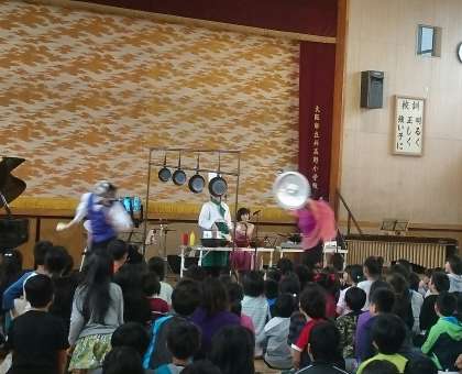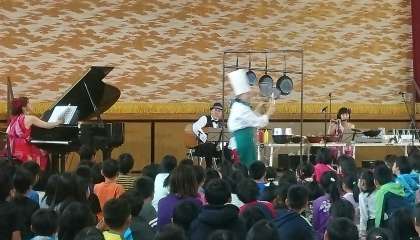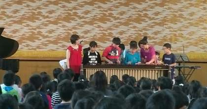 子どもたちもいろいろ体験をさせていただきました。マリンバやピアノ演奏、マラカスも使って演奏体験をしました。また、高学年を中心に、マリンバのトレモロ体験もよかったです。また、1年〜4年を中心に、打楽器参加体験もあり、手拍子、掛け声も使って大合奏になりました。