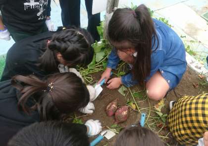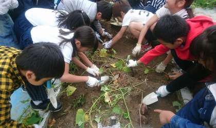 10月23日(火)の5時間目、育ててきたサツマイモを掘り出しました。今年は、早い時期からつるや葉っぱが生い茂り、例年と違う実りが期待されていました。