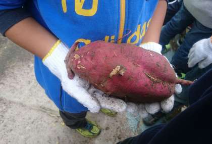 いも畑いっぱいにはびこったつる、葉っぱを引っ張り、スコップで掘り返すと、出てくる、出てくる、サツマイモがゴロゴロ顔を出しました。みんな、大喜び。中にはとてつもなくでっかいイモを掘り当てたときの笑顔、なんとも言えないですね。