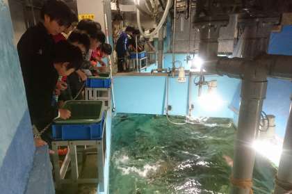 玄関を入ってすぐ、たくさんのペンギンが出迎えていました。また、ペンギンタッチ、カンパチやシマアジの餌付けの体験ができました。
