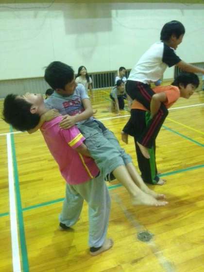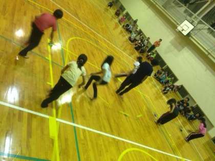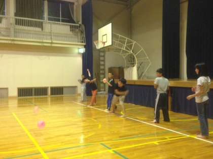 夕方からの突然の雨のため、夜のキャンプファイヤーを2日目に変更し、1日目は、室内レクレーションをしました。いろいろなものを使って、おもしろ・おかしく楽しんでいたようです。詳しい内容は、土産話としてお楽しみに・・・