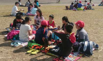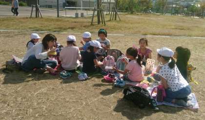 園内の芝生まで行き、お弁当です。しっかり遊んだので、お弁当が待ちきれなかったようです。暖かい日ざしを浴びながら、みんなの笑顔が最高でした。