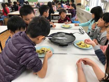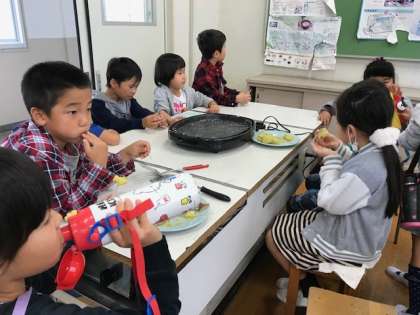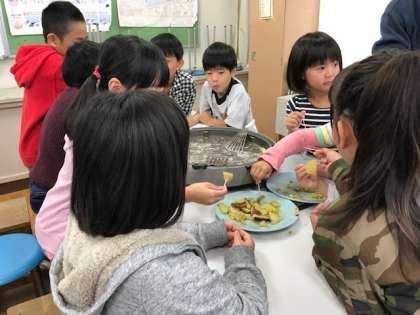 11月9日の2・3時間目に、1・2年生で「おいもパーティー」をしました。2年生が春から学習園で育てたさつまいもを1年生にふるまいました。