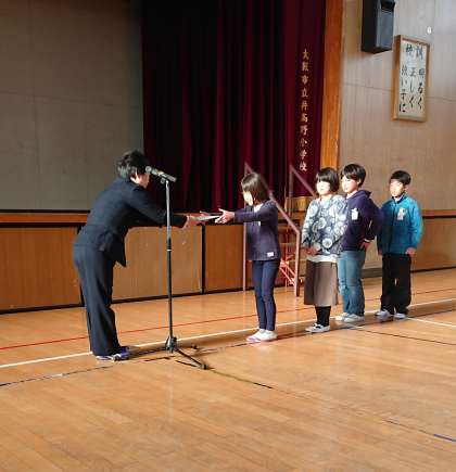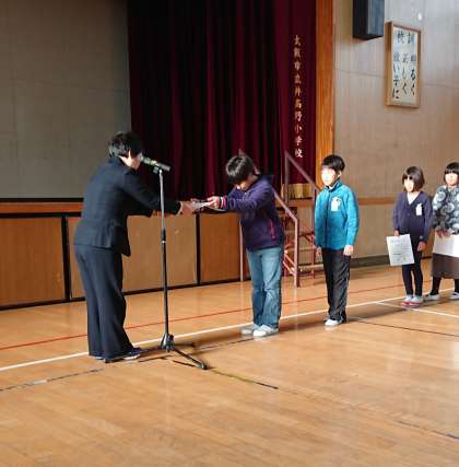12月25日(月)の終業式にあわせて、読書感想文の入賞児童の表彰を行いました。夏休みに取り組んだ読書感想文の応募作品より、入賞は4年生2名、5年生2名が表彰を受けました。