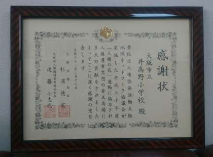 今年度、本校が「人権の花」運動に協力し、チューリップの栽培を続けてきました。新しくできた井高野ガーデンで育てています。人権啓発活動大阪地域ネットワーク協議会からの感謝状を飼育園芸委員会の代表児童に贈られました。