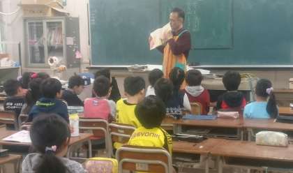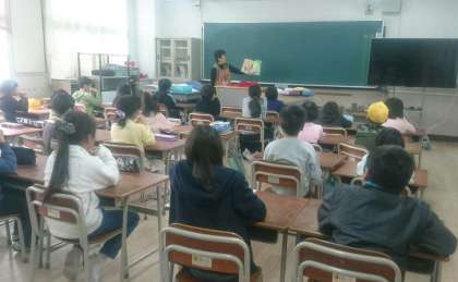 子どもたちは、集中して聞いています。井高野小学校の図書活動推進に貢献していただいています。