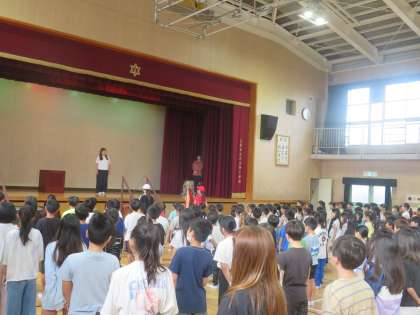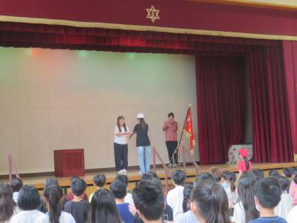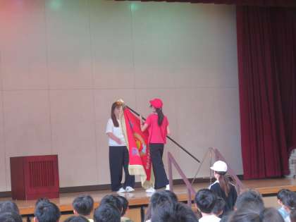 明後日の運動会を前に、講堂に集まって優勝旗・準優勝盾の返還を行いました。昨年度優勝の赤組から優勝旗、準優勝の白組から準優勝盾を校長先生に返還しました。