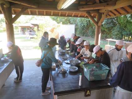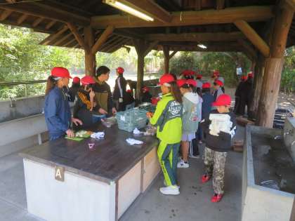 火を起こしたあと、飯盒炊飯に取りかかりました。グループ内で調理班と焚火班に分かれ、役割ごとに責任をもって取り組む姿が見られました。