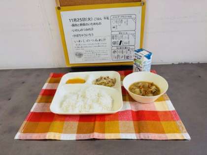 今日の給食は、いわしだんごとだいこん、ごぼう、にんじん、青ねぎなどが入った汁ものです。いわしだんごには、骨や歯をじょうぶにするカルシウムが含まれています。