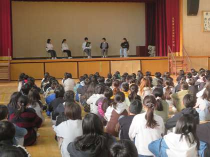 中学校の生徒会が本校の4〜6年生にスマートフォンの危険性を伝えるために来校してくれました。