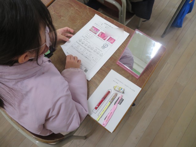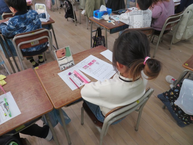 食べ物のあとに歯に付着する歯垢が、むし歯だけでなく歯周病などの原因にもなることを教えていただき、歯垢をしっかりと落とすための正しい歯みがきの仕方を学びました。