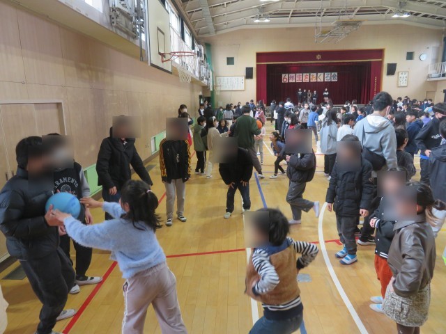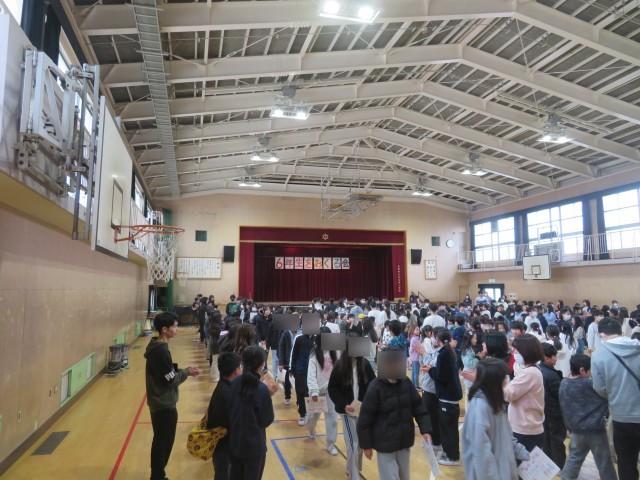 在校生が花道で卒業生を出迎えた後、たてわり班ごとに「ぐるぐるドカーンゲーム」を行いました。在校生が当たったときには卒業生へ、卒業生が当たったときには在校生へ、それぞれメッセージを伝え合い、会場は大いに盛り上がりました。