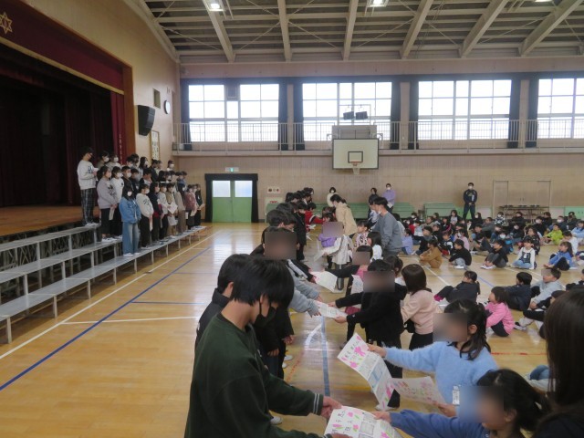 続いて、先日5年生以下の児童が作成した寄せ書きを、1年生が代表として卒業生に手渡しました。卒業生が微笑みながら色紙を見つめる姿が、とても印象的でした。