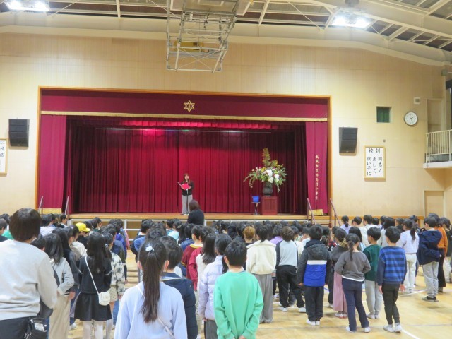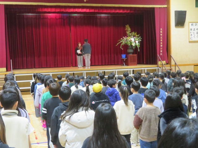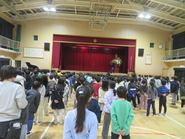 続いて、校長先生からのお話がありました。この1年間を振り返り、これまで意識して取り組んできた「自分から進んであいさつをする」「相手を思いやって行動する」「自分を好きになる」という3つのことについて、どれくらい達成できたかを考えました。また、新校舎が完成し、4月からは新しい教室で学校生活をスタートできることについてのお話もありました。