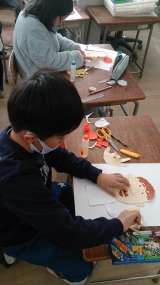 紙版画を制作しています。けん玉をもつ自分をテーマに熱心に創作に取り組んでいます。