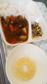 今日の給食は、牛肉と金時豆のカレーライス(近江牛)、ごぼうサラダ、パインアップル...