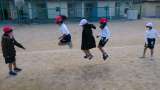 長なわを使ってなわとび運動をしています。グループで、なわを回したり跳んだりと、役...