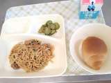 今日の給食は、オイスターソース焼きそば、きゅうりの中華あえ、パン、牛乳です。