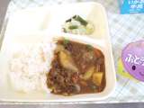 今日の給食は、ビーフカレーライス(米粉)、野菜のピクルス、ぶどうゼリーです。