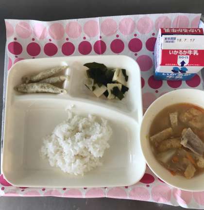 今日の給食は、きびなごやたけのこ、生わかめという春が1番おいしい時期(旬)の食材を使った献立です。