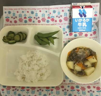 毎回、大人気の肉じゃがです。かつお梅風味のさっぱりとしたきゅうりと枝豆の組み合わせなので、とても食べやすいメニューでした。