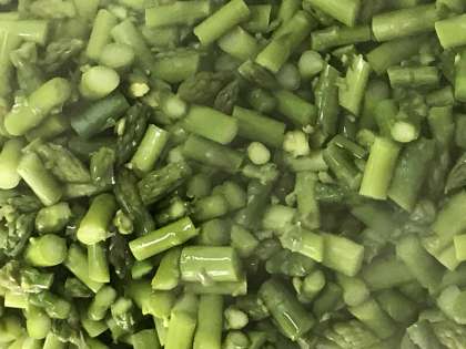 「グリーンアスパラガスのサラダ」は今からがおいしい、生のグリーンアスパラガスに砂糖、塩、ワインビネガー、綿実油で作った、手作りのドレッシングをかけあえています。