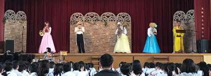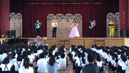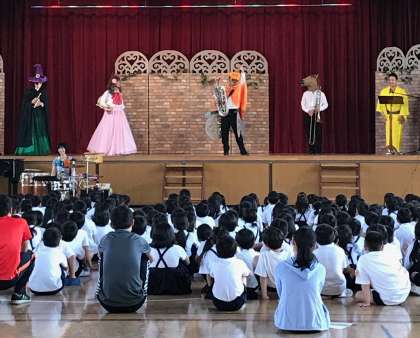 今日は、「ローゼンビート音楽研究所」による音楽劇『シンデレラ』を1〜3年生、4〜6年生の2部に分かれて鑑賞しました。途中で手拍子や掛け声をかけたりして盛り上がる場面もありました。お子様にも感想を聞いてみてください。