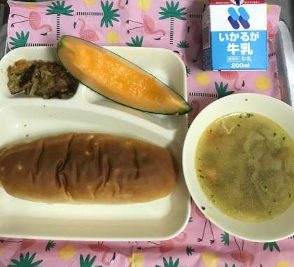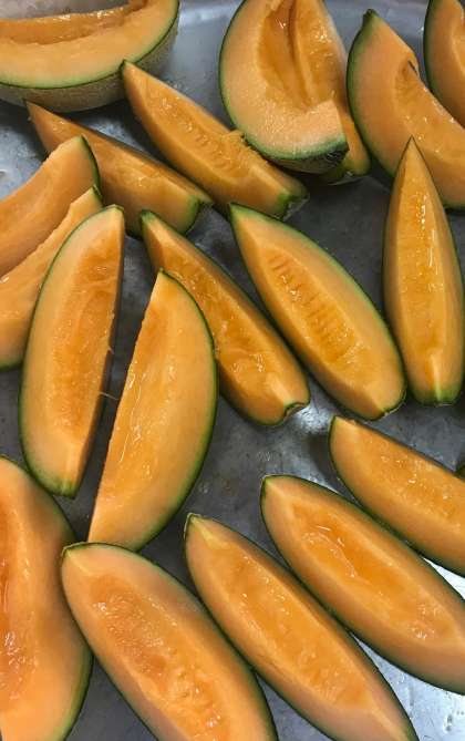 クインシーメロンは1玉を8分の1にして提供します。大桐小学校では、113玉のメロンを1/8ずつに切り分けました。