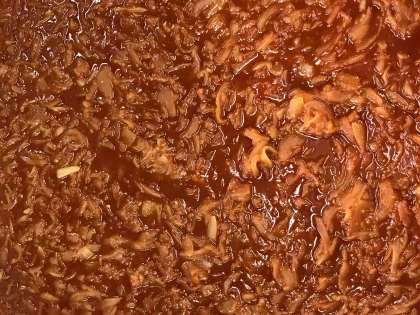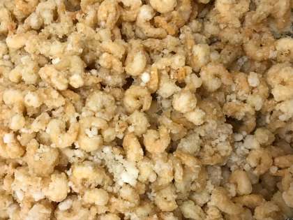 「えびチリソース」は下味をつけたえびにでんぷんをまぶして油であげ、玉ねぎなどを炒めた少し辛味のきいたソースにからませます。