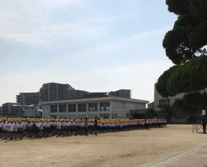 今日は晴天の中、児童朝会が運動場でありました。