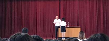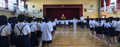 始業式では、校長先生のあいさつ、育児休暇明けで戻ってこられた先生のあいさつ、スマホサミットで表彰された児童の紹介、さわやか登校についての話がありました。最後にみんなで校歌を歌いました。
