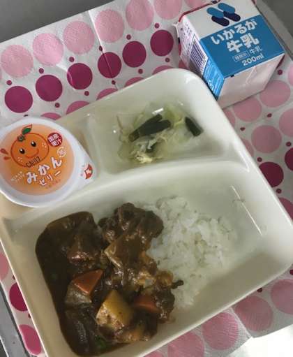 今日の「ビーフカレーライス」は米粉のカレールウの素を使用し、小麦アレルギーのある児童も食べることができます。