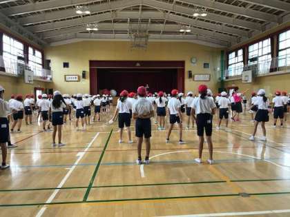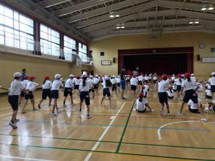 今日は講堂でペットボトルを持って、団体演技の細かい動きなどの確認をしました。
