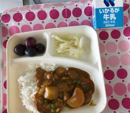 今日はみんなの好きなカレーとぶどうの組み合わせです。
