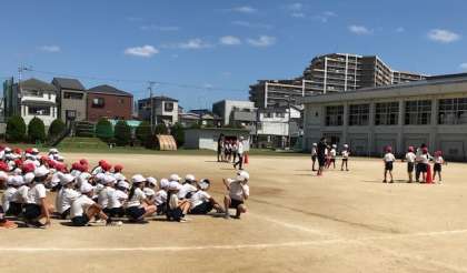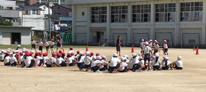 棒を持って走ります。ターンのところで工夫をしないと速くいけません。