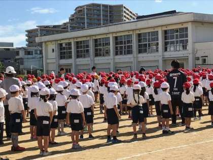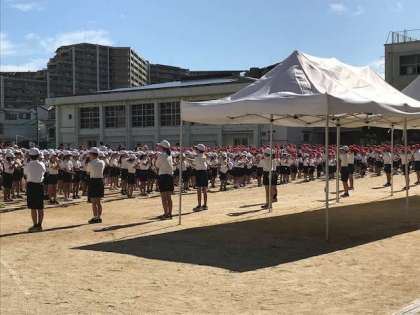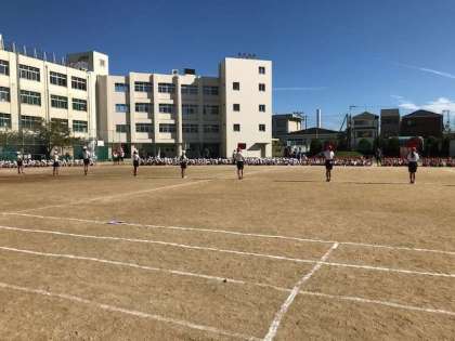 入場行進、優勝旗返還、合同体操などを一通りして、閉会式の練習で得点板の確認などもしました。