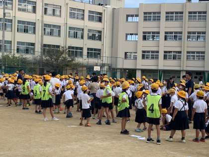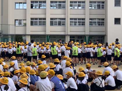 ボールを「校歌」が流れている間に後ろの人に回します。「校歌」が途中で止まり、その時にボールを持っている人がアウトになるというゲームをしました。