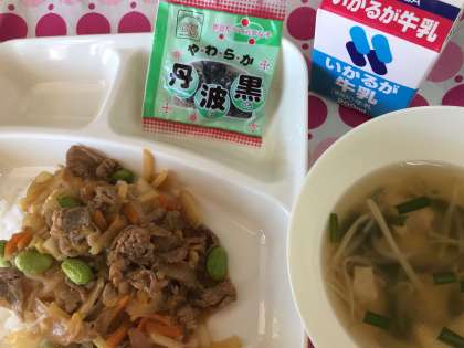 「ピリ辛どんぶり」は、豚肉を主材に、玉ねぎ、白菜、たけのこ、にんじん、青みにむき枝豆を使っています。