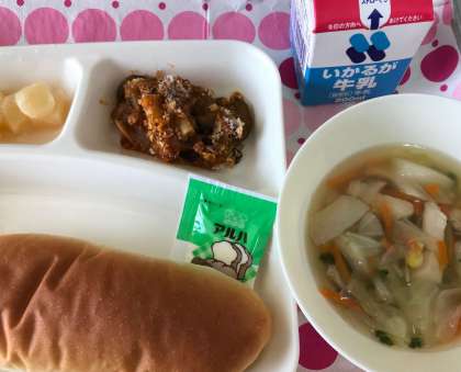 今日は苦手な児童も多い「なす」がでましたが、グラタンなのでほぼどのクラスも完食でした。鶏肉と野菜のスープもチキンブイヨンでコクのあるスープに仕上がっていて、白桃もカットされた缶詰だったので食べやすく、どのメニューも残食がほとんどありませんでした。