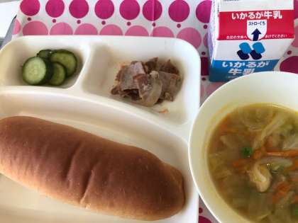 「スープ}は、鶏肉、キャベツ、にんじん、たまねぎ、だいこん、青みにグリンピースが入った具だくさんのスープです。