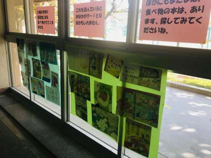 給食室でも大桐小学校の図書室にある食べ物がでてくる本を紹介してみました。ほんの一部なのですが・・・