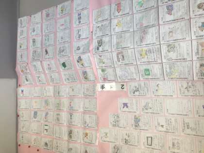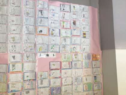 職員室前の廊下に、みなさんが書いてくれた、おすすめの本のカードをはっています。