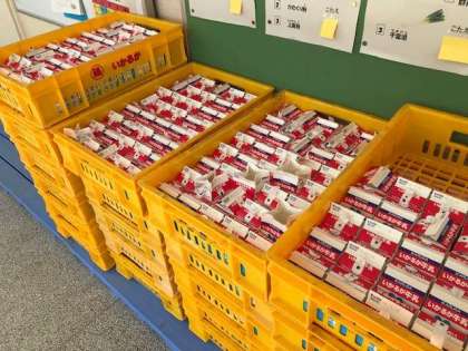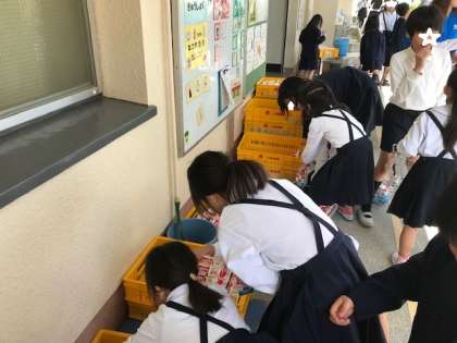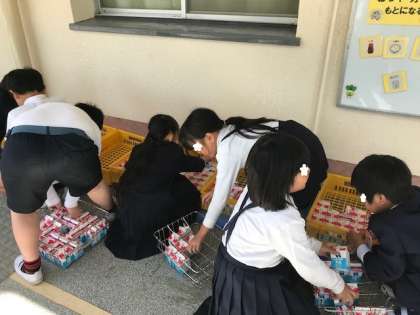いつも、給食委員会と各クラスの給食当番の牛乳の係とで、返却の時は、牛乳パックにストローが刺さったままになっていないか、飲み残しの牛乳がないかを確かめながら、きれいに並べてくれています。最後は、牛乳のケースもきれいに積んでまとめます。