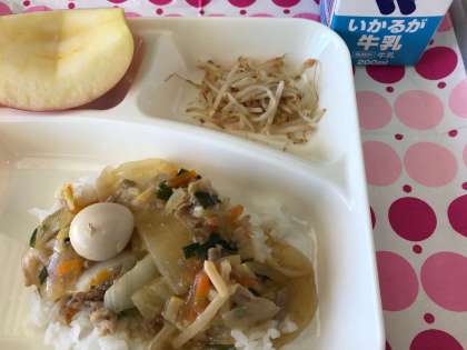 「中華どんぶり」は、豚肉、うずらたまご、旬のはくさい、たまねぎ、にんじん、にら、しょうがを使用し、塩、こしょう、濃い口しょうゆ、中華スープのもとで味付けし、最後にでんぷんでとろみをつけます。