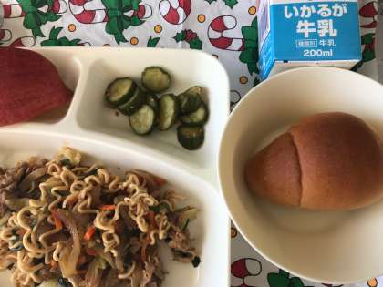 「オイスターソース焼きそば」は、めん献立のバリエーションを増やす目的で、献立に加わりました。豚肉を主材にオイスターソース、テンメンジャンなどを味付けに使用しています。しょうが、にんにくも入っていて食欲がそそられます。