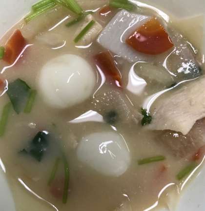 今日は、給食で雑煮がでました。給食の雑煮は、合わせみそですが白みその割合を多くした関西風です。白玉もちやなにわの伝統野菜の金時にんじんも使用しています。